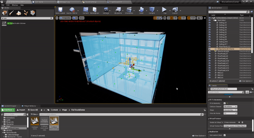 To facilitate quick and accurate placement of AkAcousticPortals and AkSpatialAudioVolumes, the Wwise Unreal Integration is able to detect surrounding static mesh geometry in a scene and determine the appropriate size and location of the portals and volumes within the scene. Fit to Geometry works for a variety of typical room, window, and door shapes. The goal of this feature is to reduce the manual effort required to correctly place geometry for Rooms and Portals. Refer to Fit to Geometry for a full walk-through of the implementation.