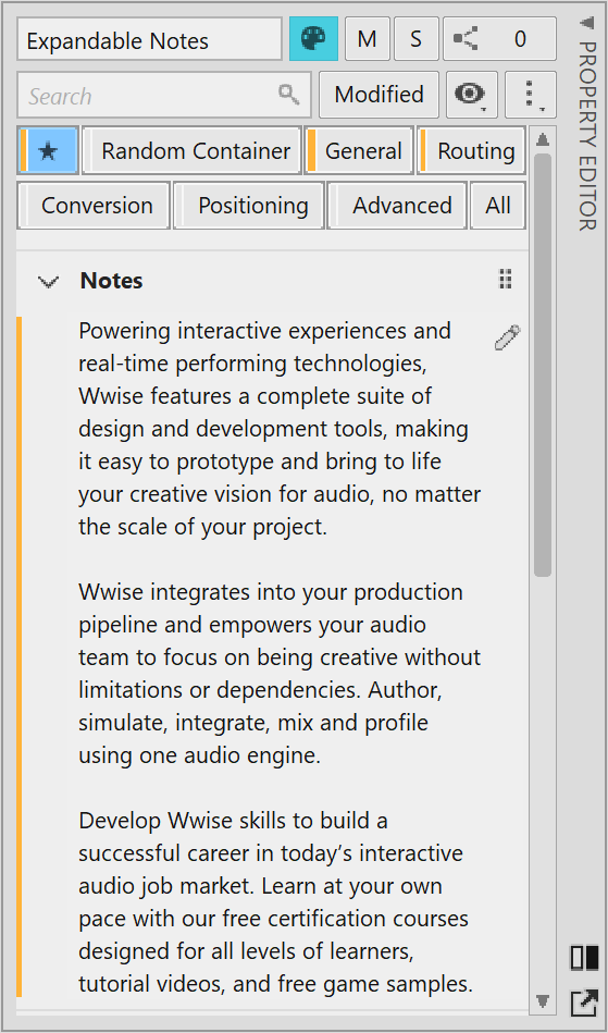 Notes fields in the Property Editor are often used to help lend context to implementation decisions, communicate clearly about uses, and sometimes serve as a way for teams to find specific objects using the Wwise Search. Notes fields now expand to present the entire contents, improving visibility.
