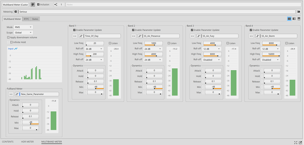 Using the existing Meter Effect to output a Game Parameter leverages dynamics to control properties throughout the audio hierarchy. The Multiband Meter is a new Effect that expands on this by metering not only the full band of an incoming audio signal, but also four separate user-configured frequency bands.