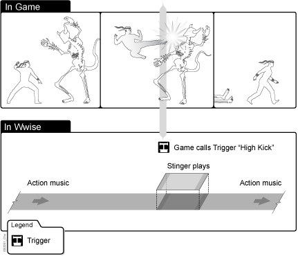The following illustration demonstrates the Trigger mechanism that plays a Stinger at a key point in the game.