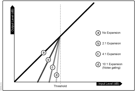 A ratio factor determines the extent of the dynamic expansion when the input is below the threshold. For example, a ratio of 4 means that for every 4 dB the input signal is below the threshold, only 1 dB will be observed in the output signal.