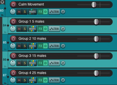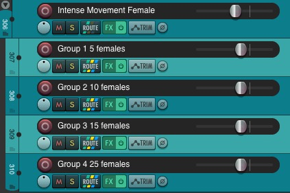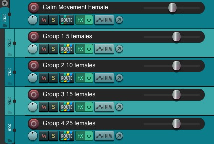 Four calm tracks of all female performers defined by group size: 5, 10, 15, and 25.