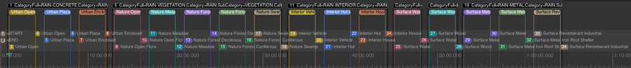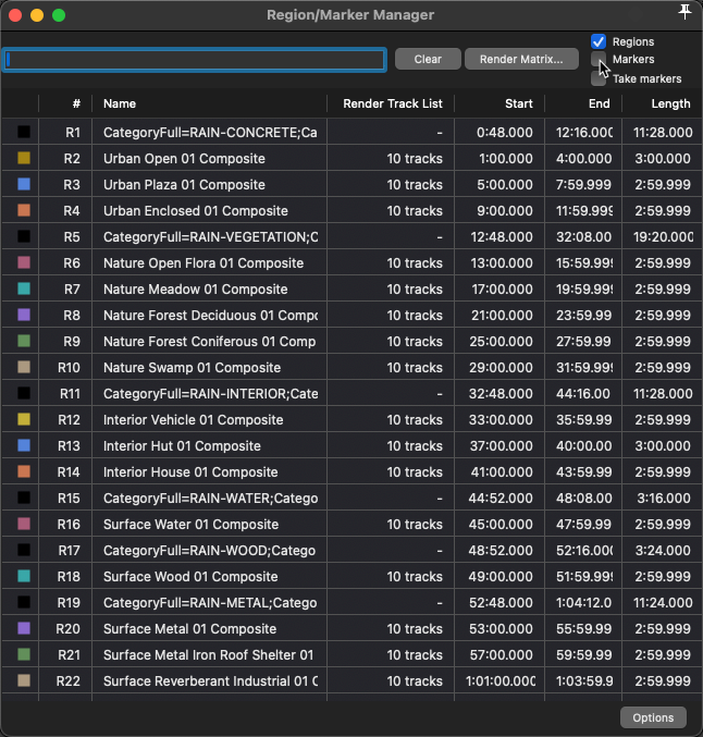 The Regions in Ambience Detailed Rain subprojects are visible in the Region/Marker Manager and in the Region Track above the timeline.