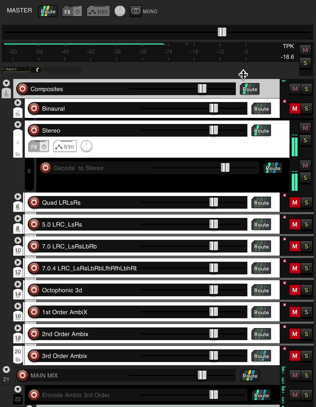 The following figure shows the Composite tracks in white. Note that the Stereo composite is routed to the parent Composites Track, while none of the other Composite tracks are routed to an output. This is the default configuration of all the Ambience collection ambisonic projects. Depending on your monitoring system and your needs, you can unmute a desired Composite track and route it to the Parent Composites Track. Don’t forget to either mute the Stereo Composite or disconnect its routing to the Composites Track. The Composites track is in turn routed to the Master Track, which is configured for 16 channels. The black subtracks of the Composite tracks have an IEM Plug-In configured to decode the output of the main mix to the desired multichannel output configuration.