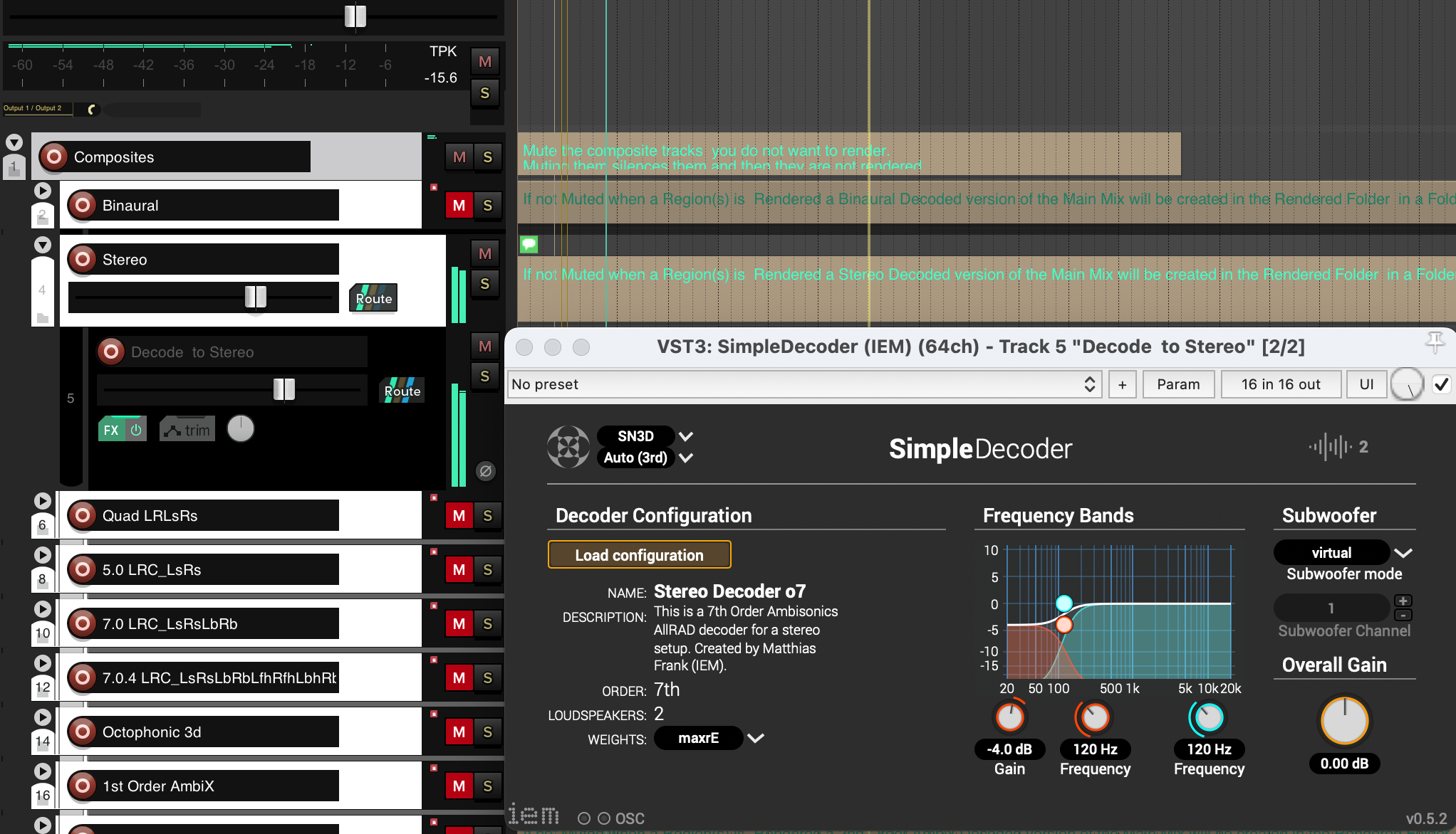 The ambisonic encoding is performed by the IEM MultiEncoder plug-in. The tracks are positioned at the top of the hierarchy of Loop Layer Tracks. Their output is routed to the Composite Tracks, where the third-order main mix is decoded to multiple track configurations simultaneously. In most cases, it is not necessary to make any adjustments to these tracks.