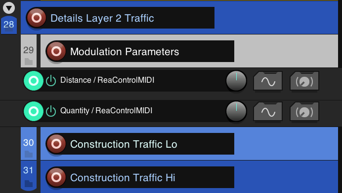 the item source files are Octo 3D ORTF recordings split into four-channel files that represent positions above or below the height of the listener’s head (Lo is below and Hi is above). Depending on the type of ambience, there is usually a Modulation Parameter track with one or more envelopes to control characteristics of the sound.