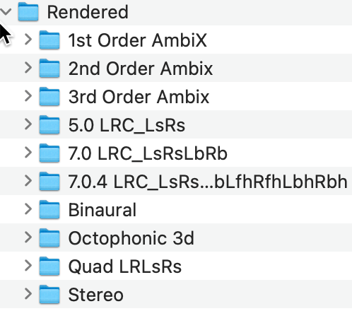 If you unmute any Composite track, select one or more regions, and then render them, the selected regions are rendered to the Rendered folder in an automatically generated subfolder named after the Composite track name and configuration. The names of the files will be the same, but they will contain metadata that indicates the channel count.