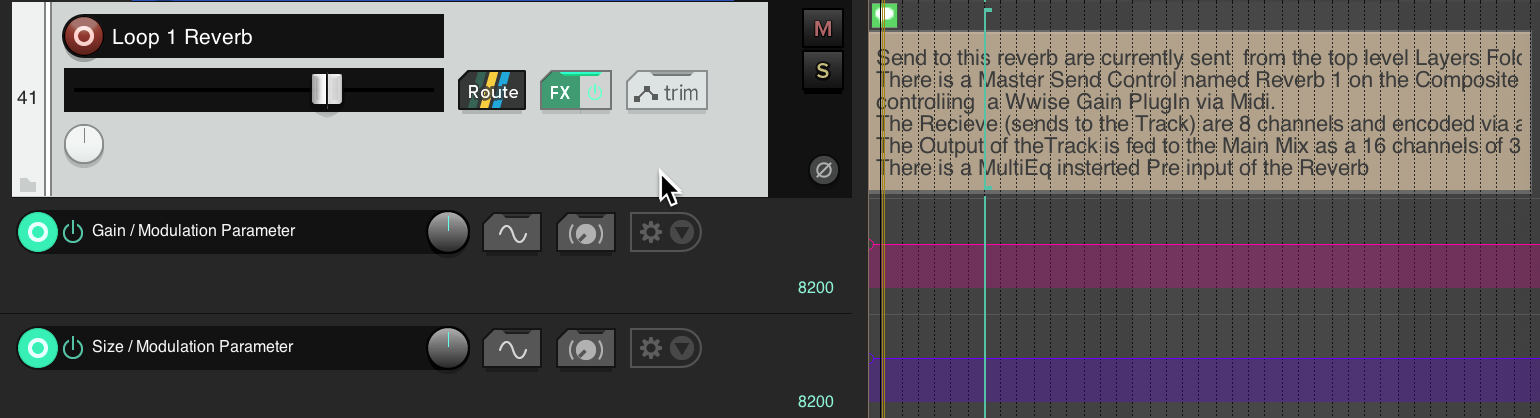The Loop Reverb tracks have multiple plug-ins that are configured to be controlled by Modulation Parameters with envelopes to control the gain and size of the reverb.