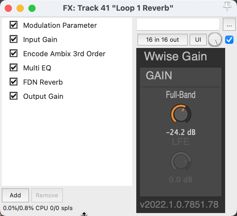 The incoming audio to the Reverb Loop track is gain controlled, then encoded to third-order ambisonic, then processed by the Multi EQ and FDN Reverb. You can also control gain after the Eq and Reverb processing. Some plug-in parameters are configured to be controlled by the Gain and Size envelopes.