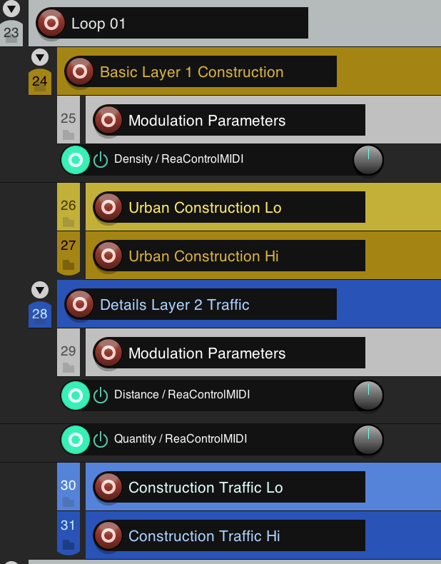 The following image displays the tracks of an Ambisonic Ambience Urban subproject, from all of the subprojects except the Additional subprojects. These projects are arranged with Layers that form ambient loops.