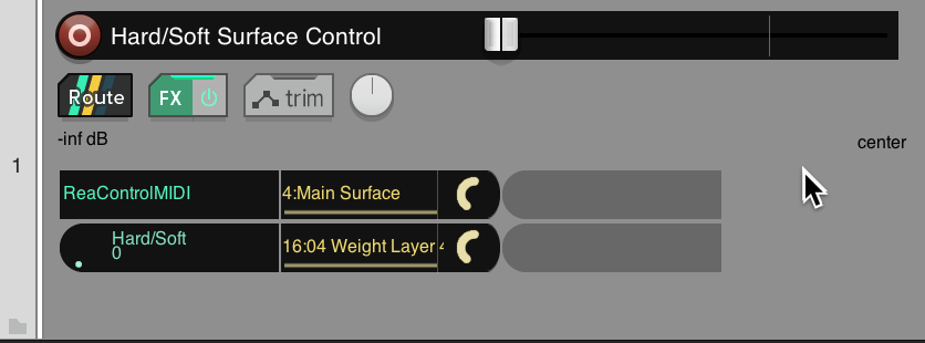 Control tracks affect the output of individual layer tracks. They control several parameters of tracks and effects simultaneously scaled to individual parameters, with automatable envelopes. They are named to correspond with what they simulate as an overall result of their manipulation. This allows complex and significant editing of multiple sounds with the adjustment of a single control. The control track is colored gray and the individual envelope control tracks are a darker shade of gray.
