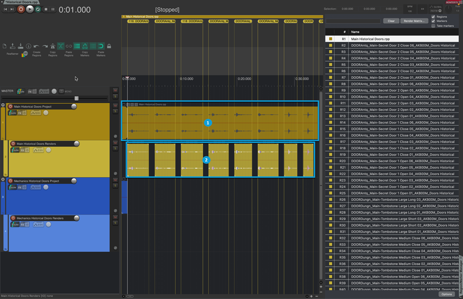 In the Doors Historical project, you can double-click any subproject media item to open the corresponding subproject, in which all of the tracks and layers available for the specific doors are arranged.