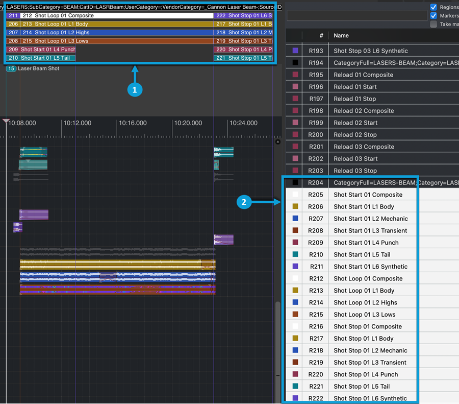 REAPER has a limitation on the size of the region layout above the timeline; it can display a maximum of seven regions simultaneously. Consequently, in the Sci-Fi Weapons collection, the Composite regions found in the Region Marker Manager might be obscured in the display of the regions above the timeline.