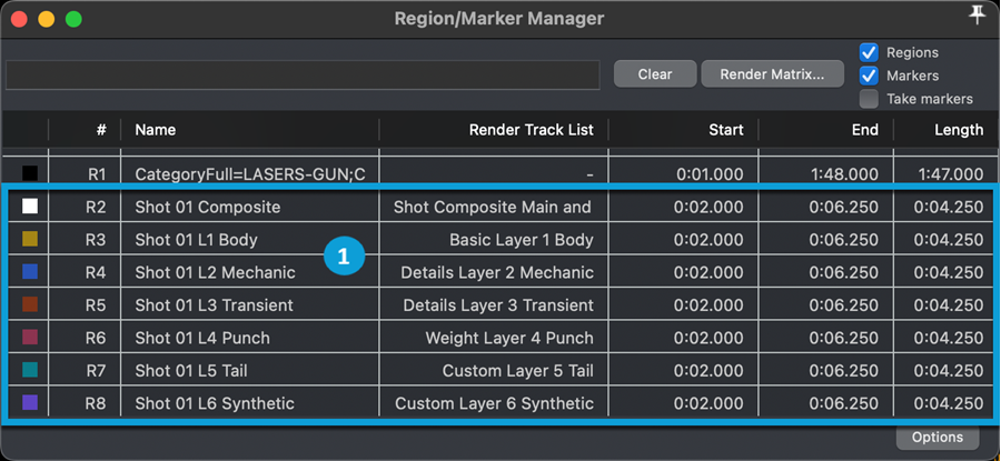In the Region/Marker Manager and in the Region Track above the timeline, you can see all of the Regions that combine to form the composite sound Shot. There are also regions specific to the reload and handling of each weapon. They are set to render from the Foley Composite track.