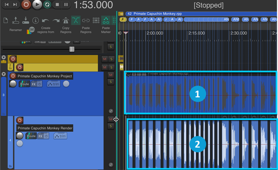 In the main project, Animal Wild.rpp, you can double-click any subproject media item to open the corresponding subproject, in which all the tracks and layers available for the specific animal are arranged.