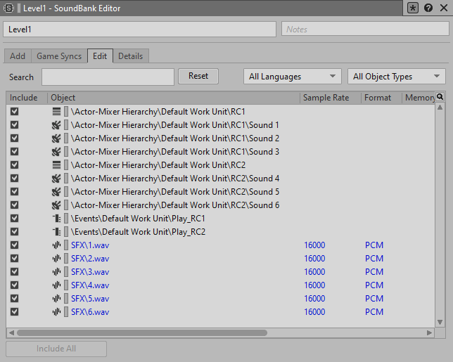 By default, the data for the two Random Containers and the six sound objects, as well as the six audio files, are also added to the SoundBank. You can view the entire contents of your SoundBank on the Edit tab of the SoundBank Editor.