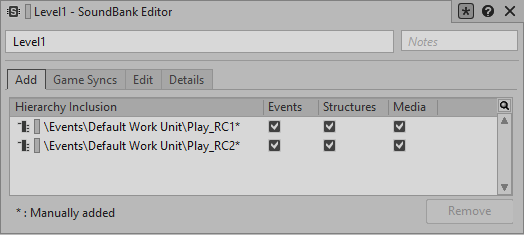 When you add an Event or sound structure to a SoundBank, Wwise automatically includes all corresponding Events, sound structures, and audio files. Depending on the SoundBank strategy you are using for your game, you might want to remove all the Events, sound structures, or media files from the SoundBank.