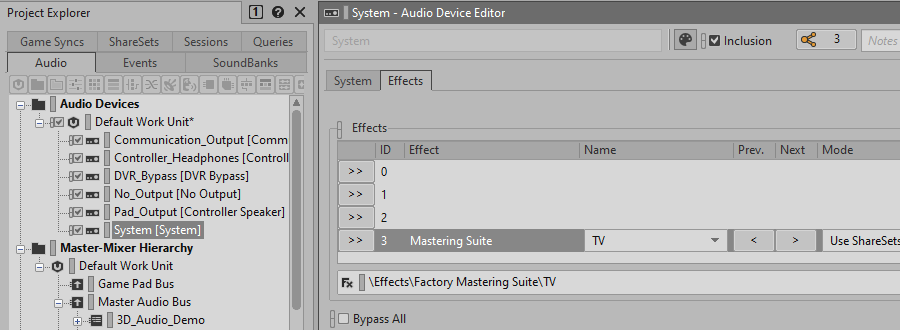 To use the Mastering Suite, the plug-in must be installed on Wwise. See Installing Premium and Partner Plug-ins. The plug-in requires a license to be activated and for SoundBanks to be generated successfully. You can acquire a free license from Audiokinetic at Plug-ins: Mastering Suite.