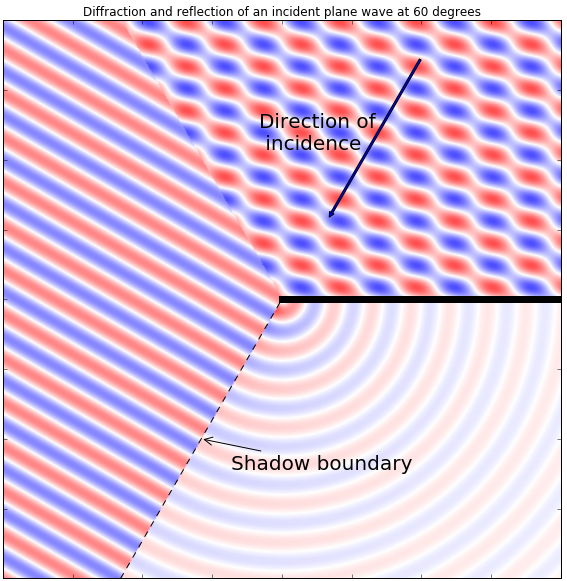 Diffraction occurs when a sound wave strikes a small obstacle, or the edge of a large obstacle or opening, and bends around it. It represents sound that propagates through openings (portals) and towards the sides, which means that a listener does not need to be directly in front of the opening to hear it. Diffraction is important in games because it informs players about paths that exist between them and sound emitters. The following figure is a sound field plot of a plane wave that comes from the top right and hits a finite surface (the black line) that starts in the center of the figure. The perturbation caused by this edge is called diffraction. The region on the left is the View Region, where the plane wave passes through unaltered. The top right is the Reflection Region, where reflection with the surface occurs and is mixed with the incident wave, which results in the jagged pattern. The lower right is the Shadow Region, where diffraction is significant. The figure is an approximation. In reality, the field is continuous at the region boundaries, and edge diffraction occurs in the View Region as well, although it is generally negligible compared to the incident wave itself.