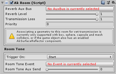 AkSoundEngine.PostEvent anywhere in your code. You can also code your own triggers, so they appear in the list for your co-workers. See Adding New Triggers for Wwise Events.The boundaries of a room are dictated by the collider on the same game object as the AkRoom component. Triggers with that collider will set other game objects in the room with AK::SpatialAudio::SetGameObjectInRoom().