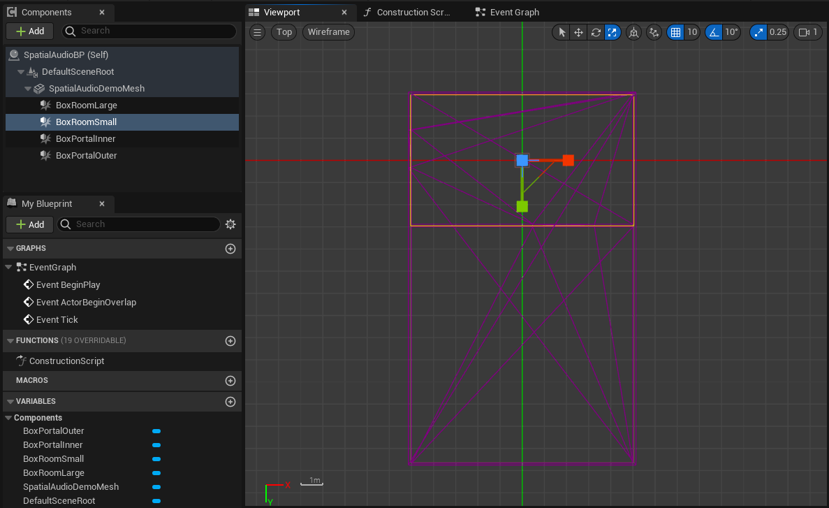 So far, we have built everything directly in our level, using prebuilt actors or adding components to individual actor instances. It's also possible to use the various spatial audio components to construct a Blueprint actor that can be replicated throughout the level. In this section we will build a replica of the structure from section Unreal Project Preparation, using a Blueprint class so that it can be easily added or spawned throughout the world.