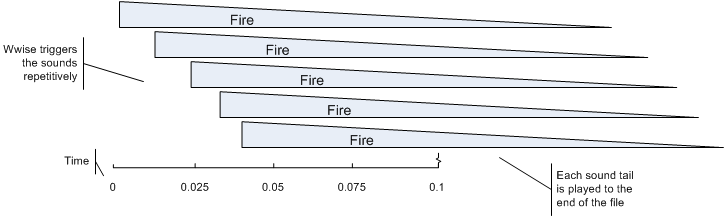 When the “Fire” container is played back in Wwise Authoring, and the Transport Control is set to Play Originals, the timing of each fire sound might not perfectly match the frequency defined in the Duration field. This is because original audio files are streamed from the hard drive. This is a playback limitation in Wwise Authoring only; when played back in game, the fire sounds are triggered at the exact frequency defined in the Duration field. You can get better timing in Wwise Authoring by selecting Play Converted from the transport play options. Beforehand, make sure you select Convert All Audio Files from the Project menu. Otherwise, you'll hear nothing. |