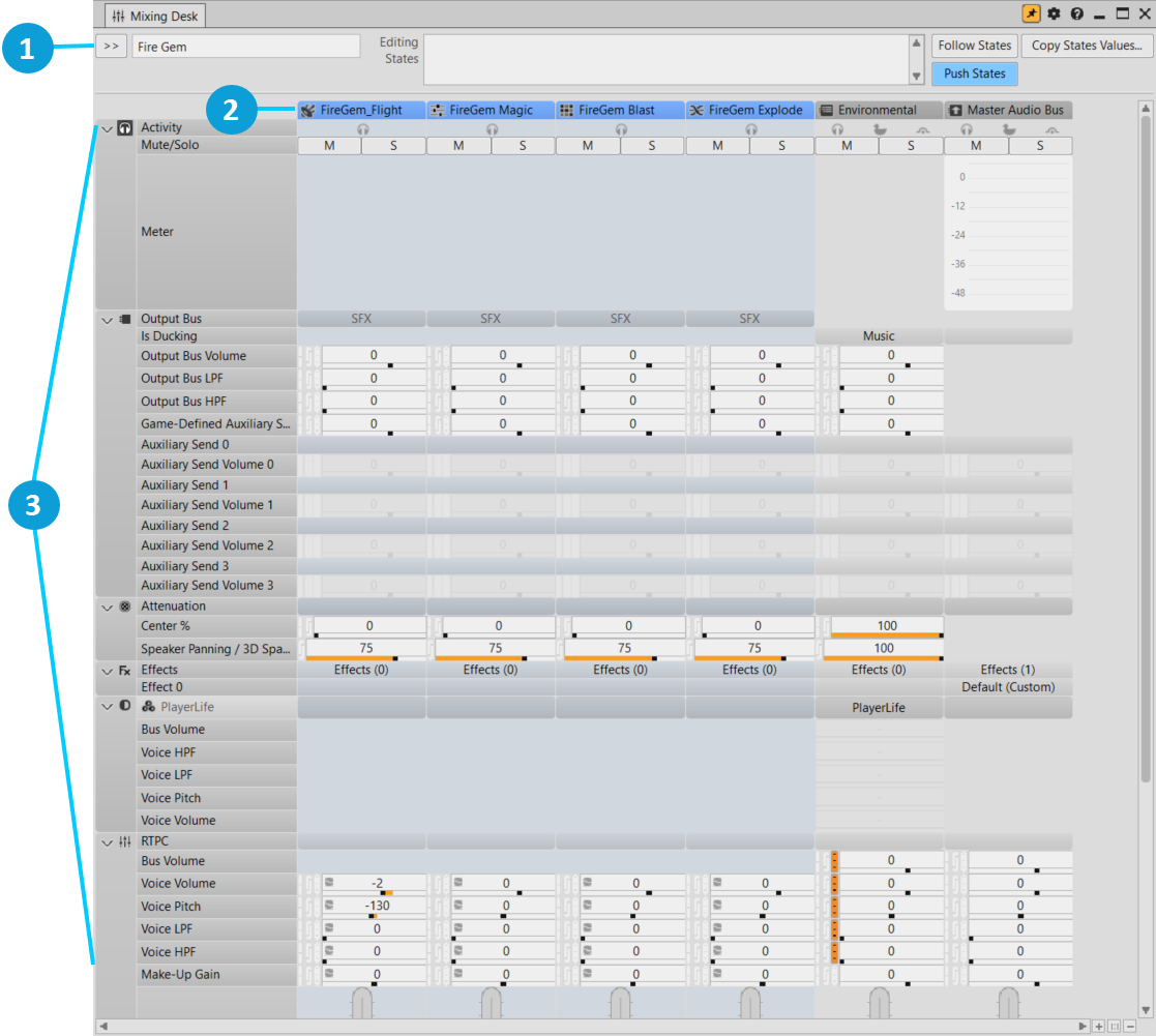 The Mixing Desk is a flexible and powerful mixing console that groups a variety of properties into one view allowing you to fine-tune the audio mix of your game in real time. You can add any object or bus to the Mixing Desk and then define object routing, apply effect and Attenuation ShareSets, edit state properties, and modify the properties of individual objects and busses.