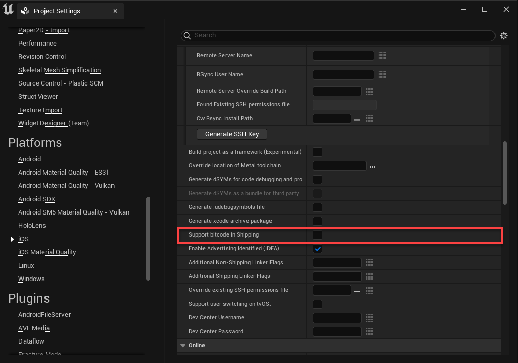 Since 2019.2.8, The Wwise SDK for iOS is built using XCode 12. If you are still using XCode 11, it is necessary to disable Bitcode for the shipping configuration. You can do so in the Unreal Project Settings for the iOS platform. Using the Edit > Project Settings menu, scroll the left pane until the "Platforms" section is visible. Click "iOS". In the "Build" section, disable "Support bitcode in Shipping".