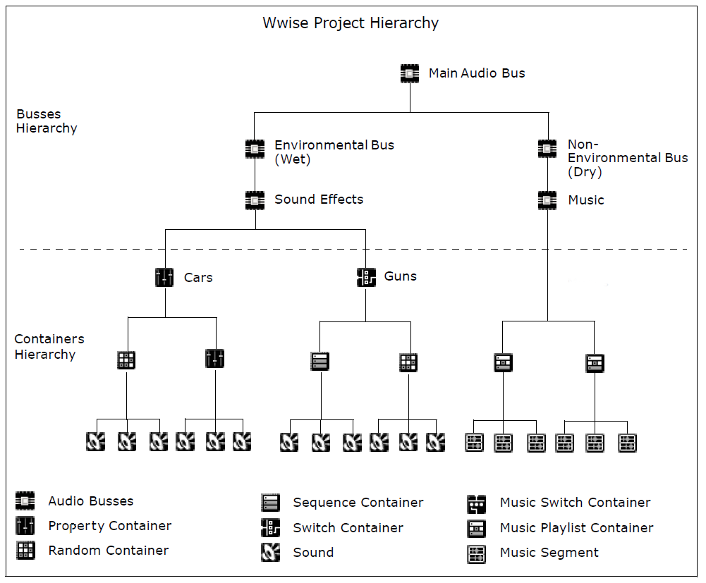 Containers hierarchy—groups and organizes all the sound, music, and motion assets in your project using a series of Wwise-specific objects.