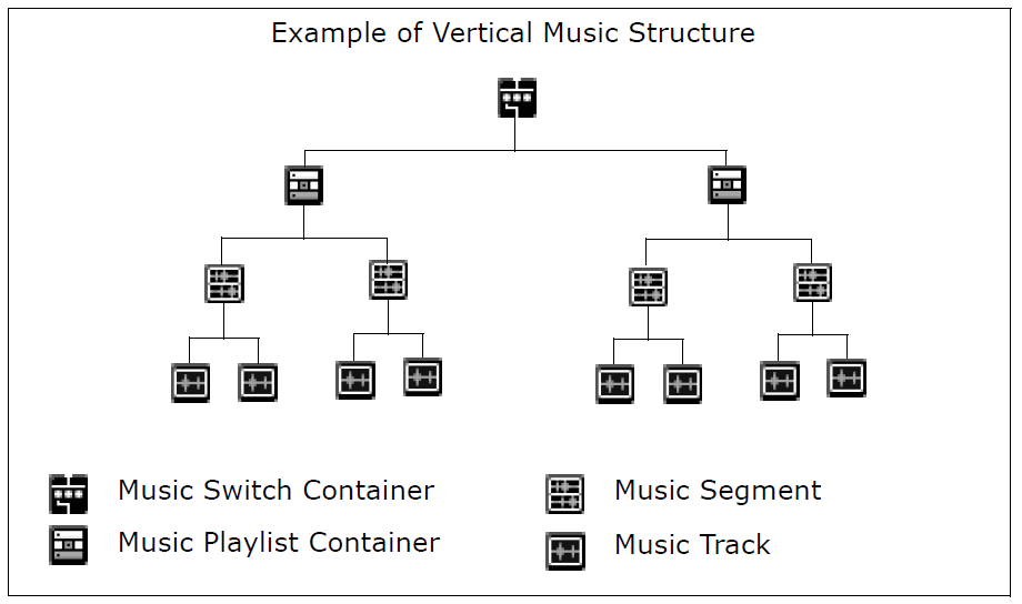 Wwise offers you great flexibility when it comes to creating the interactive music for your project. There is an almost infinite number of ways to assemble interactive music objects into a game score. However, following some kind of consistent structure can make your workflow more efficient.
