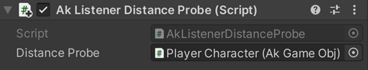 The following example assumes that you have a Unity project that is set up for a third-person perspective game. You must have a camera GameObject that will be used as the listener, and a player character or other GameObject that will be assigned as the Distance Probe. Note that by default, an Ak Audio Listener component is added automatically to the main camera.
