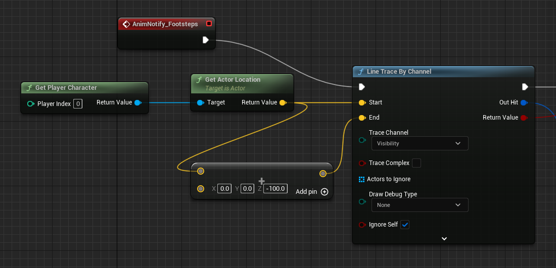 Configure the first part of the Blueprint with a Line Trace By Channel function to detect the player character's footsteps, as shown in the following image.