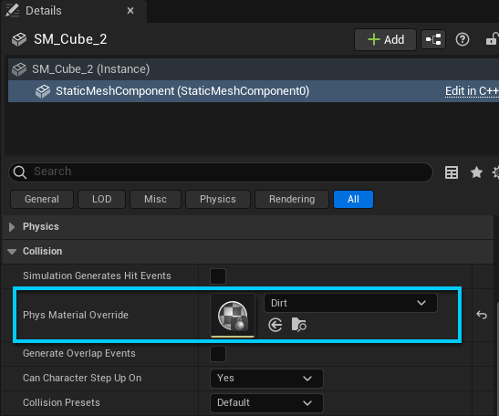 In the Collision section, set the Phys Material Override to the desired Physical Material.
