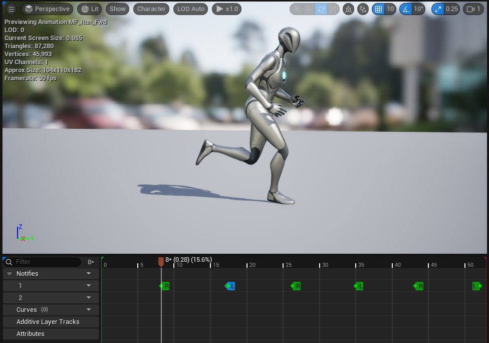 This procedure uses the same MF_Run_Fwd animation sequence from Adding Footstep Anim Notifies.