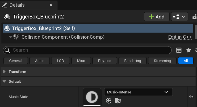 In the level, walk into the new Trigger with the ThirdPersonCharacter and wait for the music to change.