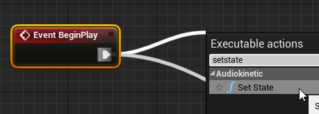 In the Blueprint Editor, drag a SetState Audiokinetic function from BeginPlay.