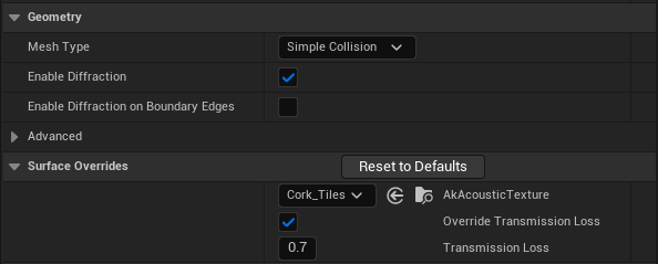 When an object appears between the emitter and the listener, the sound can pass through the object. Spatial Audio models this phenomenon by filtering the direct path of the sound. Transmission loss values ranging from 0 to 1 can be applied on AkSurfaceReflectorSetComponent, AkGeometryComponent or AkRoomComponent components. The transmission loss value is then sent to Wwise where the associated filter is applied according to the transmission curves of the sound's Attenuation ShareSet. Typically, a value of 1.0 represents full loss, and a value of 0.0 indicates that sound can be transmitted through the geometry without any loss.