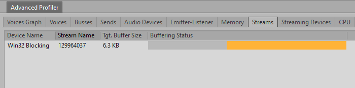 When no data has been requested, the status bar is empty. When the full width of the status bar is gray, the stream's buffering has reached its target and the stream becomes idle. As the sound engine consumes data from the stream, the buffer length decreases, bringing it below the target. At this point, the stream requests more data. If the buffer is not restored to its target length, the status bar turns orange (or blue in the Classic theme). The color(s) of the status bar are based on the instantaneous state of the stream when it was last sampled by the profiler. The following image shows an example of a status bar that is part gray and part orange. However, with most modern data storage devices, transitions between a fully gray bar and a fully orange (or blue) bar happen very quickly, often between frames. Hence, in most cases, you will observe a status bar that is either one color or the other. ![]() | |||