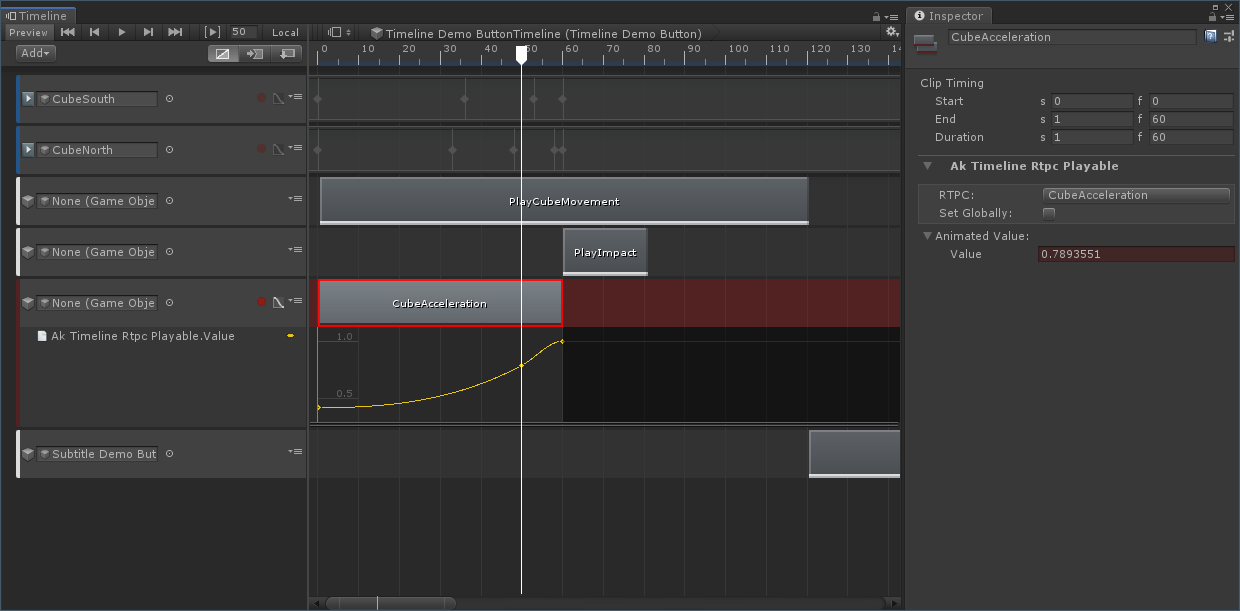 The Wwise Unity Integration adds two new Timeline tracks, the AkTimelineEventTrack and the AkTimelineRtpcTrack, and two deprecated Timeline tracks, the AkEventTrack and the AkRTPCTrack.