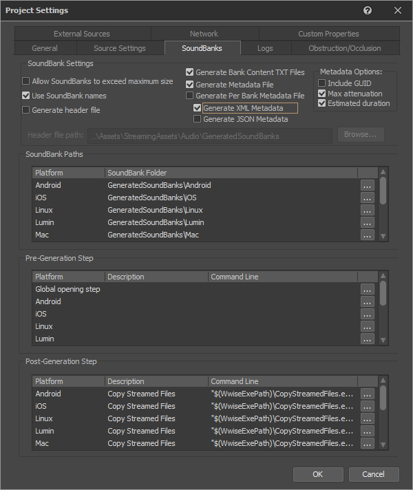 To ensure that Event lengths are properly represented in the AkTimelineEventTracks, the Wwise project needs to be set up to estimate the duration of its audio Events and XML metadata must be generated. To enable these project-wide settings, go to the Project Settings' SoundBanks tab. Enable the Estimated duration check box within the Metadata Options group box and enable the Generate XML Metadata check box within the SoundBank Settings group box, as seen below.