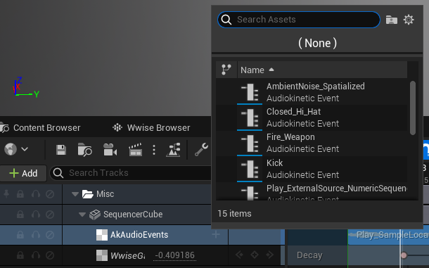 If a level sequence is played from the Sequencer editor window while Unreal is running in Play in Editor (PIE) mode, any AkAudioEvent tracks that are associated with game objects do not trigger events. To hear AkAudioEvent tracks that are bound to game objects, you must trigger the level sequence from the Game World.