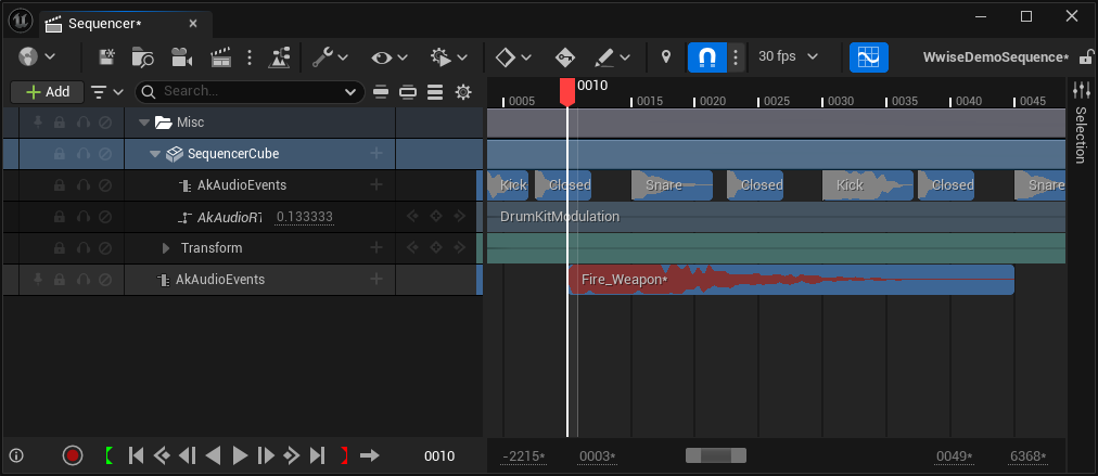 In general, we recommend that you use very simple AkAudioEvent sections in the Level Sequencer, such as a simple Play action on a Sound SFX. Avoid more complex Wwise Events such as those that contain delayed actions, Seek actions, or which reference Random Containers, Sequence Containers, and other non-deterministic objects. If you do use such Events, divide them into simpler events for optimal use in the Level Sequencer.