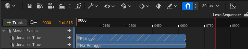 If the length of the AkAudioEvent section exceeds the maximum estimated duration of the Wwise Event, the section contains either a flat white line or repeating diagonal lines. The flat white line indicates that the Retrigger property is disabled. The repeating diagonal lines indicate that the Retrigger property is enabled. The Retrigger property determines whether Wwise events are retriggered in the Sequencer after they finish (refer to AkAudioEvent Section Properties).