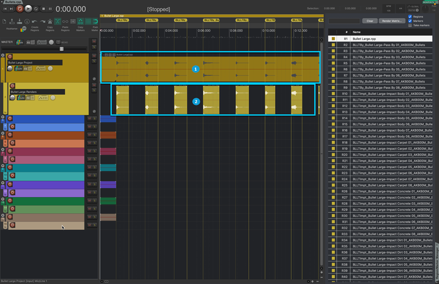 The main Doors SciFi project provides a convenient way to visualize, locate, and audition the sounds in the Doors Sci-Fi collection. Additionally, it is a central point from which you can open the individual subprojects of the collection. The main project contains tracks for each subproject of the collection, with media items that reference the various subprojects in nested tracks. You can audition any of the media items that reference the rendered output from the corresponding subprojects.