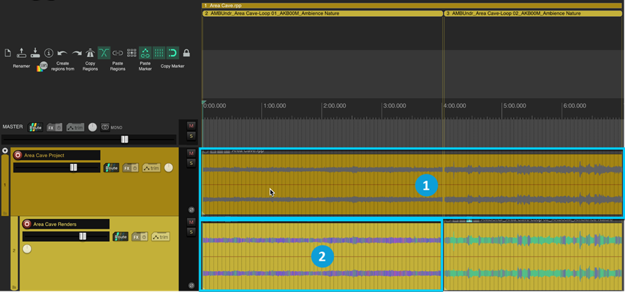 The subprojects are configured to render as seamless loops and have control tracks for rapid customization. In addition to the Area and Interior subprojects set up for ambisonic mixing, there are also Object subprojects for each area and interior, configured for mono and stereo rendering for use as point source objects to populate and dynamize your world.