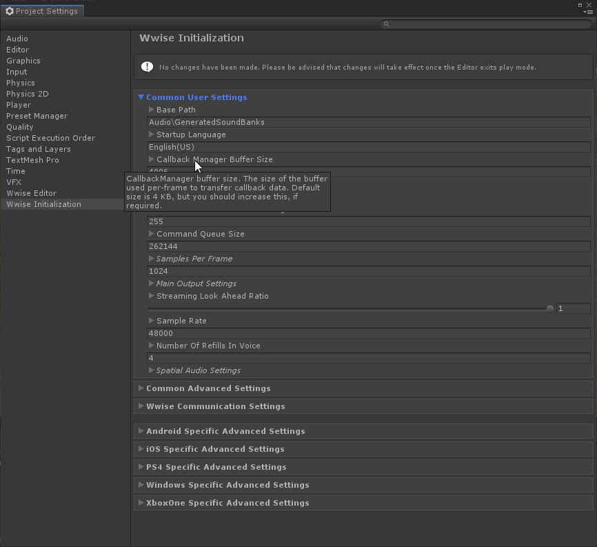 Project Settingsウィンドウが開くと、Wwise Initialization Settingsが、直感的に把握しやすい次の4つのグループに分かれて表示されます: Common User Settings、Common Advanced Settings、Wwise Communication Settings、 Platform Specific Advanced Settings( Platform に、あなたが作業中のプラットフォームが入ります)。設定項目はすべて、フィールドでもチェックボックスでもスライダーでも、このインターフェースで直接編集できます。使いやすいように、全ての設定項目に関してヒントが表示されるので、そのパラメータの情報や、可能な設定値などが分かります。