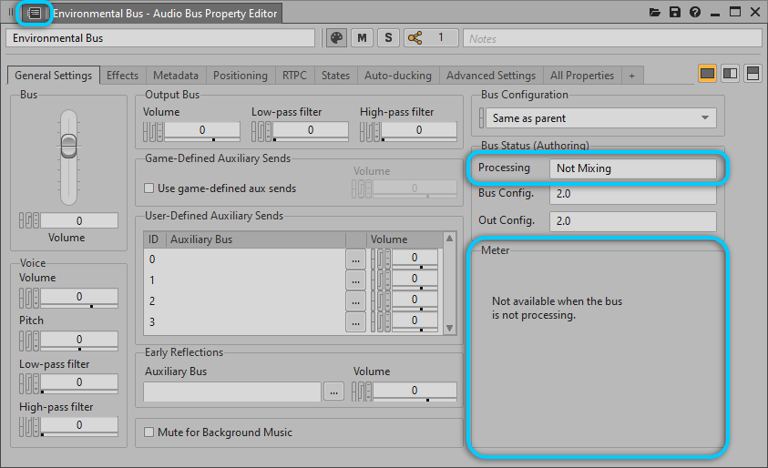 WwiseがAudio Busに与える処理ステータス。Not Mixingバスのプロパティは、このバスにルーティングされてくるオブジェクトや、このバスに継承されますが、処理は行わないので、オブジェクトや子のフォーマットは変わりません。Not Mixingバスに対してオーサリングしたプロパティは、ルーティングされてくるオブジェクトにボイスレベルで適用されます。 バスがNot Mixingとなるのは、以下が当てはまるときです: