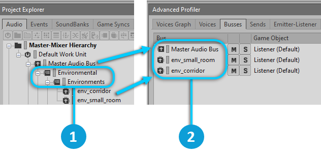 Mixingバス、Processing Audio Objectsバス、Processingバスは、これらの場所に表示されます。下図を見ると、その様子が分かります。Advanced ProfilerのBussesタブに、EnvironmentalバスやEnvironmentsバスは表示されていませんが、その子であるAuxiliaryバスのenv_corridorや、env_small_roomは、表示されています。これはEnvironmentalバスとEnvironmentsバスがNot Mixingバスで、その子バスはProcessingバスだからです。