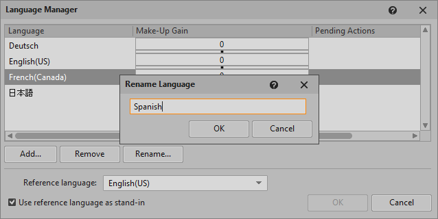 The Language Manager queues all requested actions (Add, Remove, Rename, or set Make-Up Gain). Click OK or Cancel to execute or discard all pending actions respectively. After clicking OK, you are prompted to confirm the action.