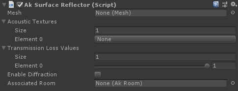 - AkSurfaceReflector コンポーネントで、 Surface Reflectorメッシュの各サブメッシュに透過損失値を関連付けるために、Transmission Loss Valuesアレイを設定します。